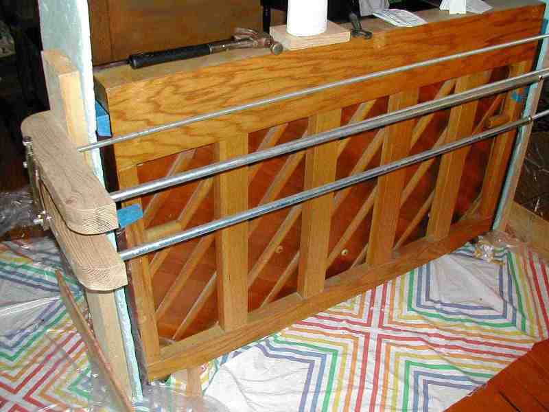 2. The rear view of the piano as it is being clamped, waiting for the glue to cure overnight. The diagonal wood strips on the back of the soundboard are called "ribs". They keep the soundboard ridgid, and help support the pressure of the strings. If the ribs separate from the soundboard, buzzing usually results, sometimes only for certain notes at certain volumes. Rib repair is relatively easy, and common in older pianos.