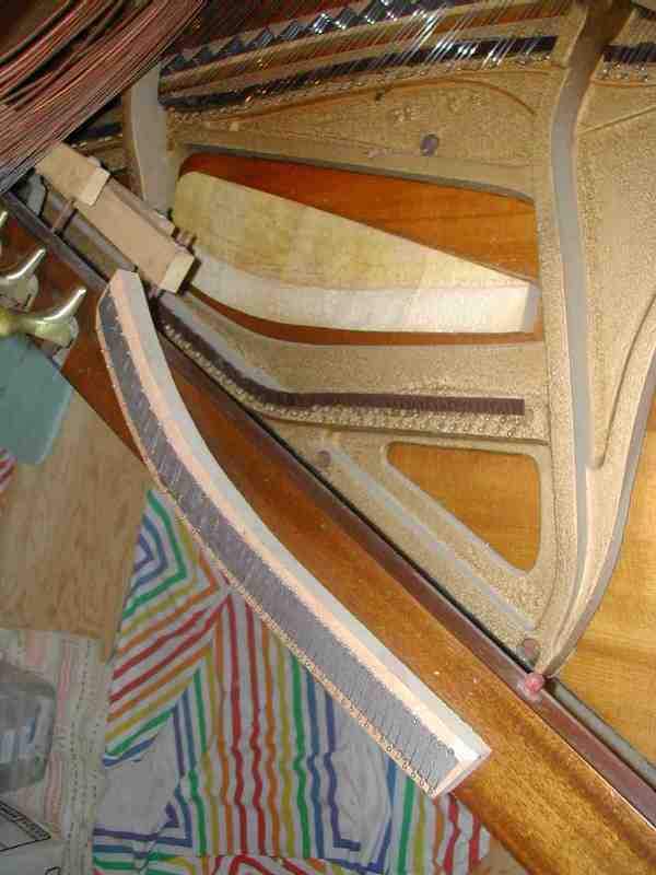 5. Here is a bridge from the bass section of a piano, resting on the bottom board of the case next to the pedals. The copper-wound bass strings have been removed and are visible at the upper left. The glue joint failed between the bridge and the light-colored "shelf", which connects the bridge to the soundboard. This piano sounded very dead in the bass, with an ugly buzz on several notes, sounding something like a honking goose. The repair restored a strong, full bass to this 40 year old piano, now in use by the family's third generation of piano students.