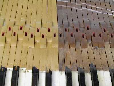 4. Keys from an older upright piano, showing the condition before and after gentle cleaning in an abrasive blasting cabinet. These keys later had new white keytops applied, new bushing cloth installed, and brass capstans polished. They now look and play like new keys, providing a solid foundation for all other action adjustments.